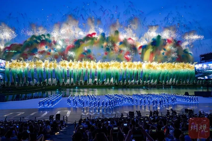 随后,在“天府之檐”下,文体表演《锦绣之韵》、主题曲表演《友爱之声》接续上演,将运动项目与中华文化、巴蜀元素有机结合,展示出“运动无限 气象万千”的主题。在万众期待下,世运圣火在湖中点燃,以水火相生的科技创新美学,向全世界传递梦想之光。
