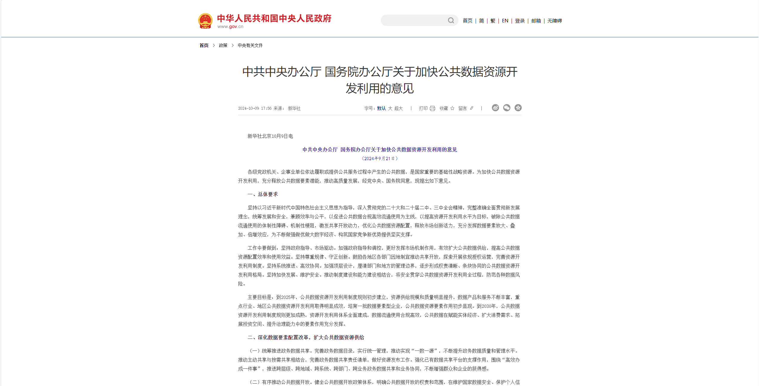 各级党政机关、企事业单位依法履职或提供公共服务过程中产生的公共数据,是国家重要的基础性战略资源。为加快公共数据资源开发利用,充分释放公共数据要素潜能,推动高质量发展,经党中央、国务院同意,现提出如下意见。