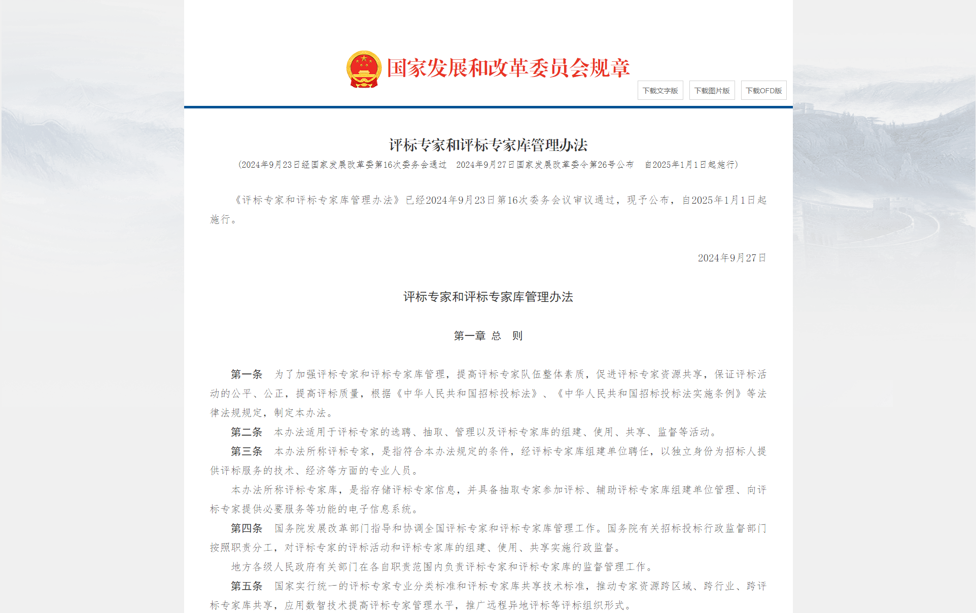 《评标专家和评标专家库管理办法》已经2024年9月23日第16次委务会议审议通过,现予公布,自2025年1月1日起施行。